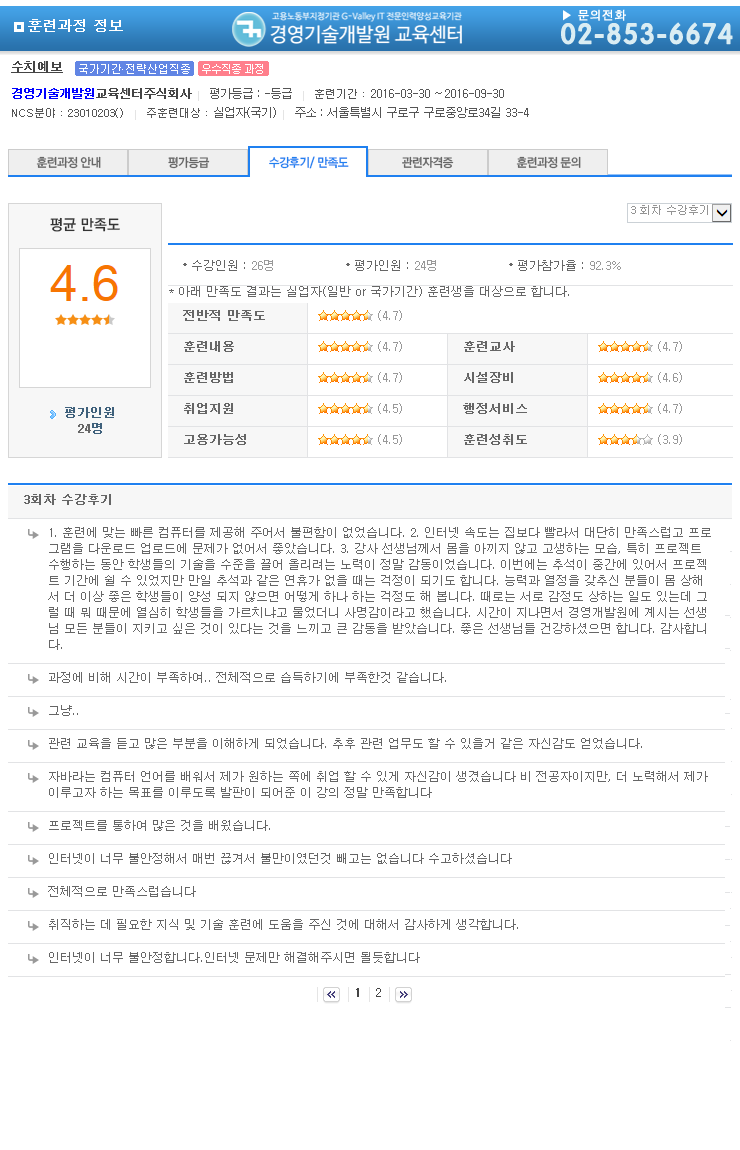 °æ¿µ±â¼ú°³¹ß¿ø±³À°¼¾ÅÍ¿¡¼ °øºÎÇÑ ±³À°»ýµéÀÌ °í¿ë³ëµ¿ºÎ(HRD-NET)¿¡¼ ÀÛ¼ºÇÑ ¼ö°Èıâ/¸¸Á·µµ¸¦ º¸½Ç ¼ö ÀÖ½À´Ï´Ù.