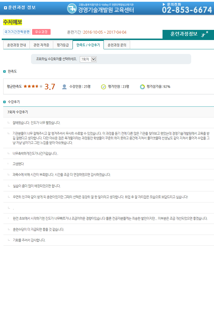 °æ¿µ±â¼ú°³¹ß¿ø±³À°¼¾ÅÍ¿¡¼ °øºÎÇÑ ±³À°»ýµéÀÌ °í¿ë³ëµ¿ºÎ(HRD-NET)¿¡¼ ÀÛ¼ºÇÑ ¼ö°Èıâ/¸¸Á·µµ¸¦ º¸½Ç ¼ö ÀÖ½À´Ï´Ù.