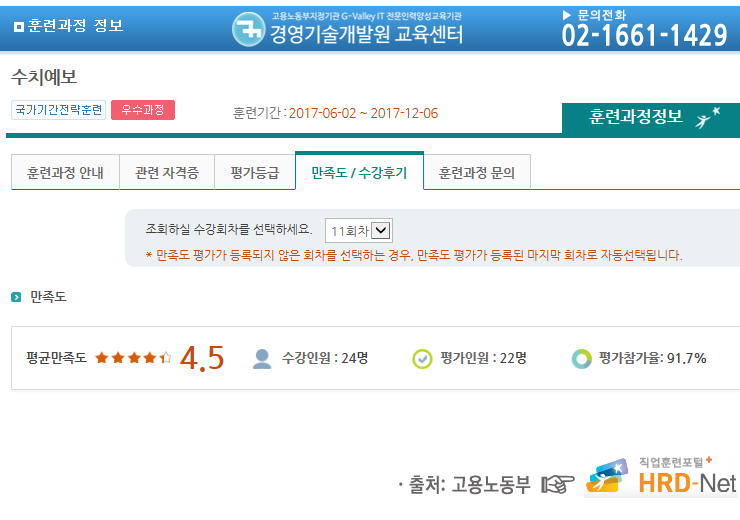 °æ¿µ±â¼ú°³¹ß¿ø±³À°¼¾ÅÍ¿¡¼ °øºÎÇÑ ±³À°»ýµéÀÌ °í¿ë³ëµ¿ºÎ(HRD-NET)¿¡¼ ÀÛ¼ºÇÑ ¼ö°Èıâ/¸¸Á·µµ¸¦ º¸½Ç ¼ö ÀÖ½À´Ï´Ù.