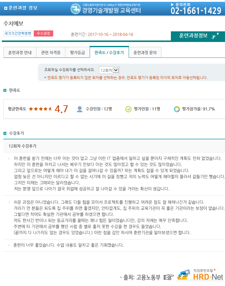 °æ¿µ±â¼ú°³¹ß¿ø±³À°¼¾ÅÍ¿¡¼ °øºÎÇÑ ±³À°»ýµéÀÌ °í¿ë³ëµ¿ºÎ(HRD-NET)¿¡¼ ÀÛ¼ºÇÑ ¼ö°Èıâ/¸¸Á·µµ¸¦ º¸½Ç ¼ö ÀÖ½À´Ï´Ù.